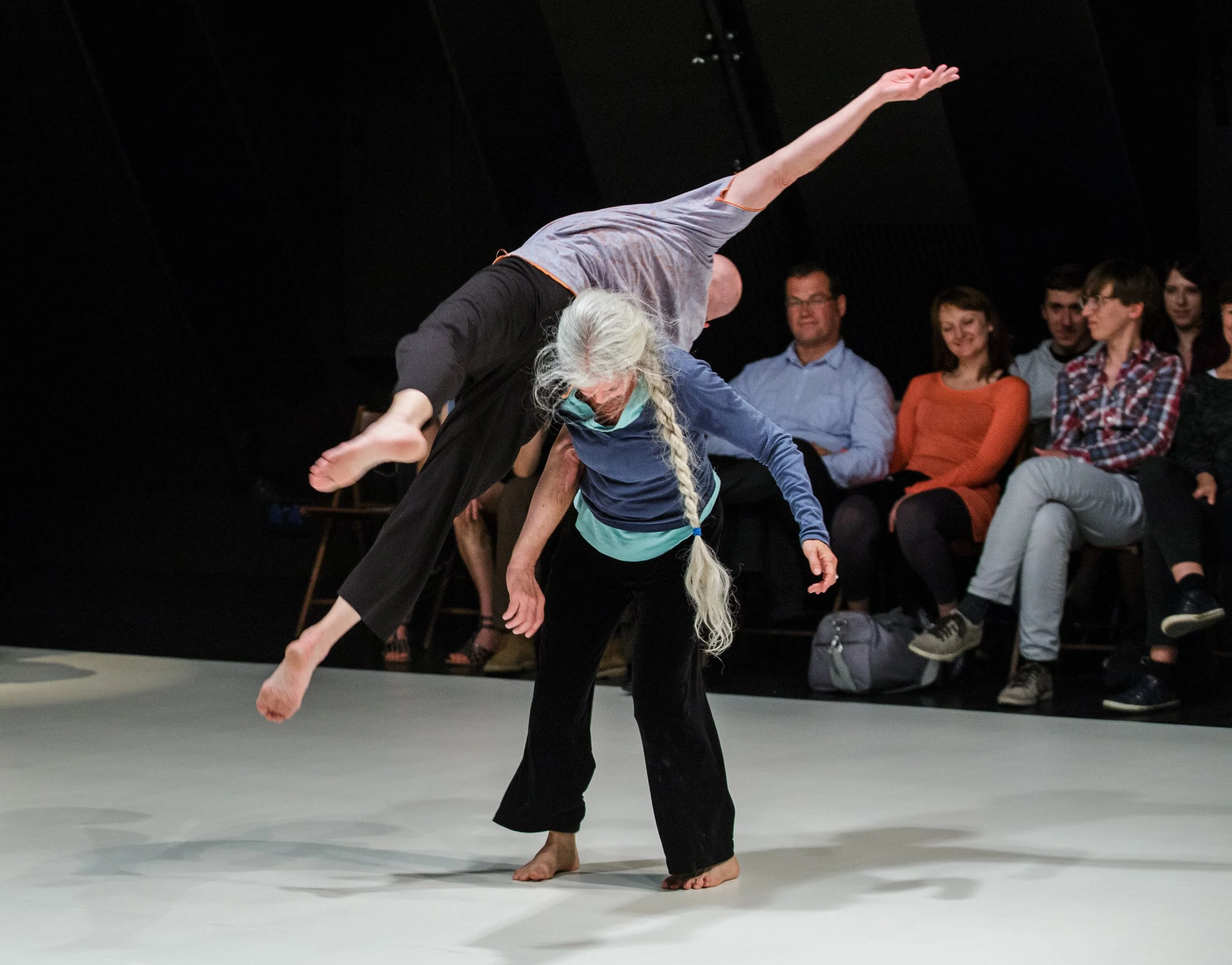 In this class we will play with spherical space by exploring the buoyancy and ease through the air and softly back down to the ground. To support the loft, we familiarize ourselves with our ever shifting centers of gravity. We listen for the nuance in weight exchange, playing with modulating tone, pressure, counterbalance and counter tensions of support. As underdancers, we investigate the multitude of ways our bodies provide surface, offering structure and agility for our partners to willingly and harmoniously perch or hitch a ride.